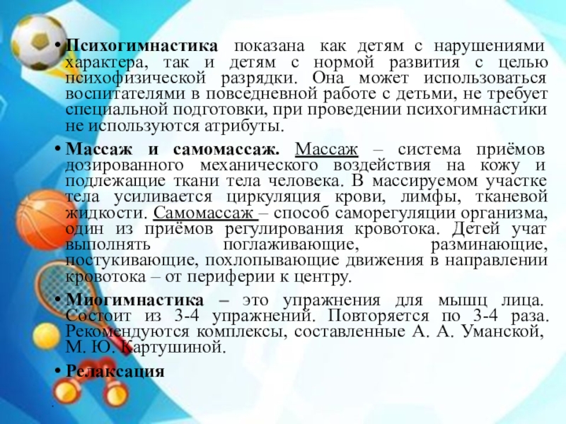 Слайд 21Психогимнастика показана как детям с нарушениями характера, так и детям с