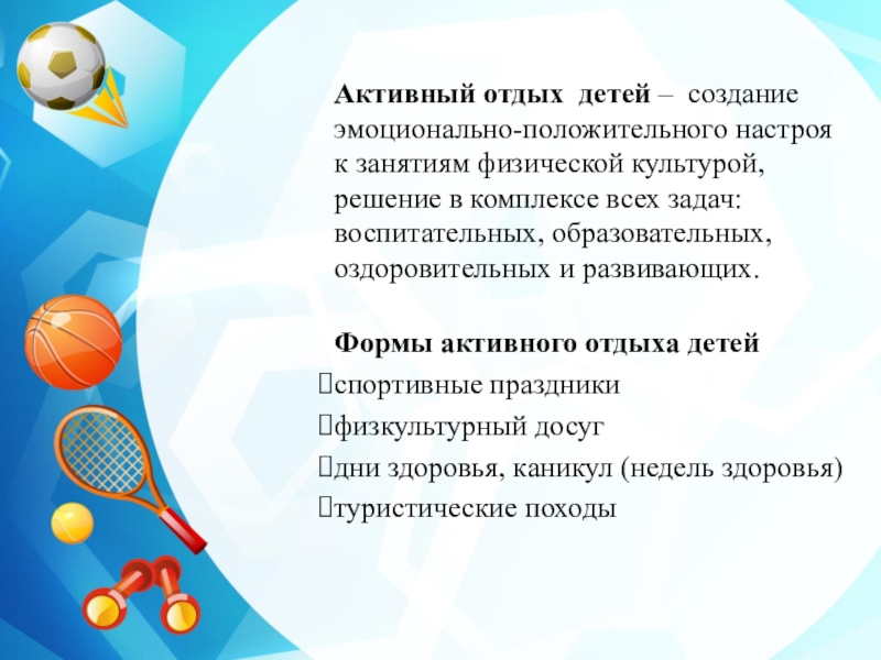 Слайд 23Активный отдых детей – создание эмоционально-положительного настроя к занятиям физической культурой,