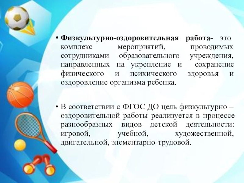 Слайд 2Физкультурно-оздоровительная работа- это комплекс мероприятий, проводимых сотрудниками образовательного учреждения, направленных на