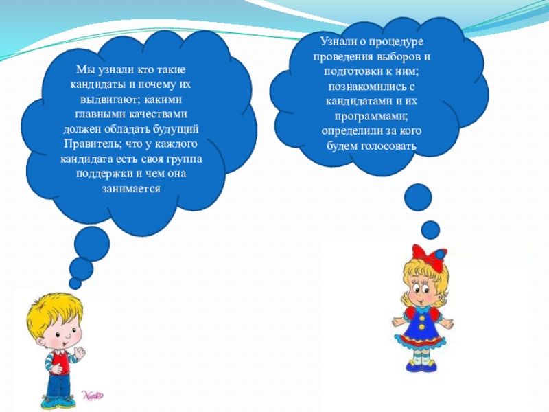 Узнали о процедуре проведения выборов и подготовки к ним; познакомились с кандидатами и их программами; определили за кого будем голосовать