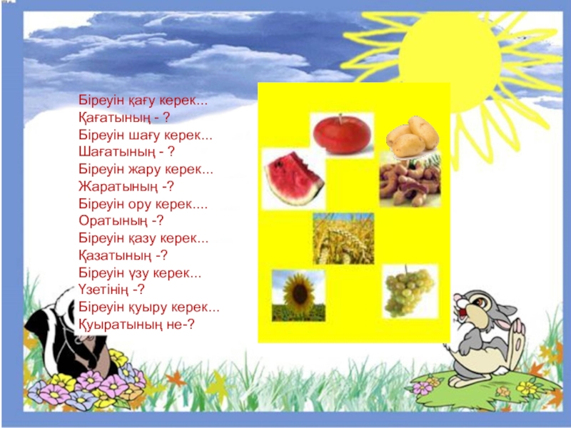 Біреуін қағу керек... Қағатының - ? Біреуін шағу керек... Шағатының - ? Біреуін жару керек... Жаратының -?