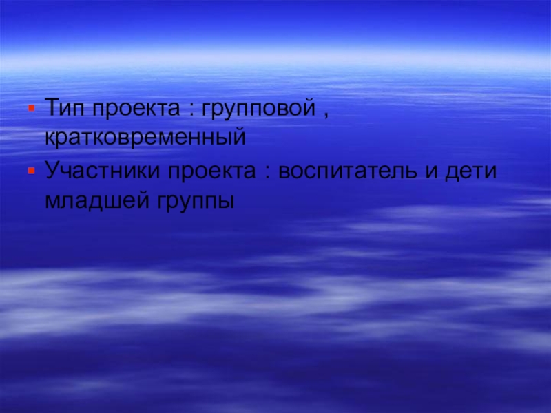 Тип проекта : групповой , кратковременныйУчастники проекта : воспитатель и дети младшей группы