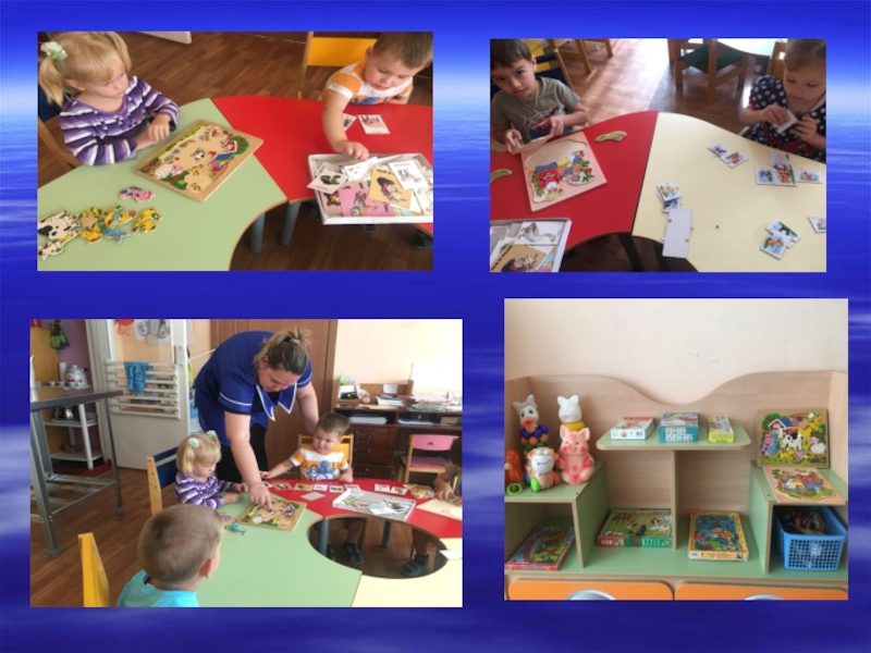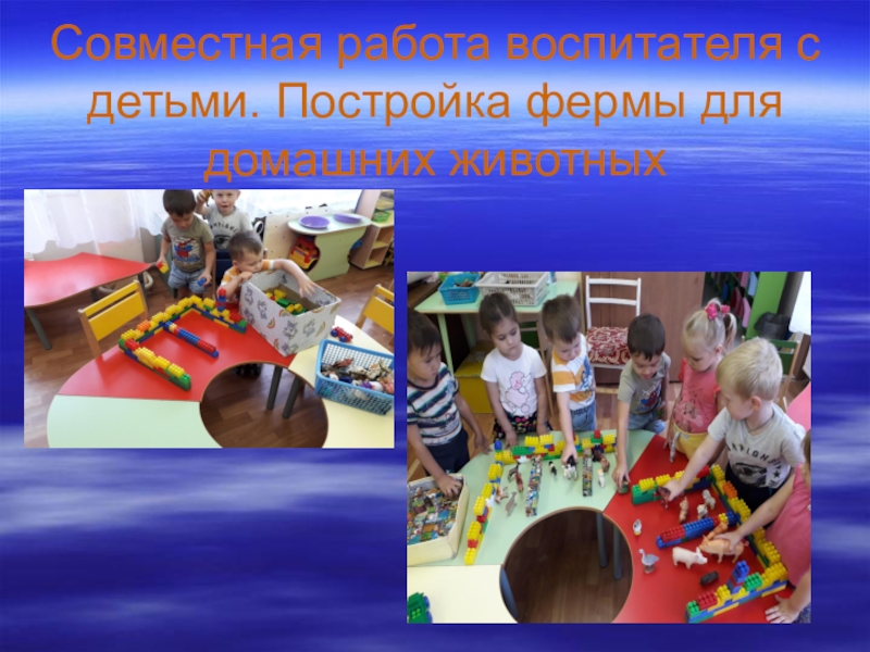 Слайд 17Совместная работа воспитателя с детьми. Постройка фермы для домашних животных