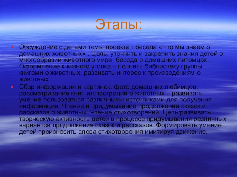 Этапы:Обсуждение с детьми темы проекта : беседа «Что мы знаем о домашних животных» . Цель: уточнить и