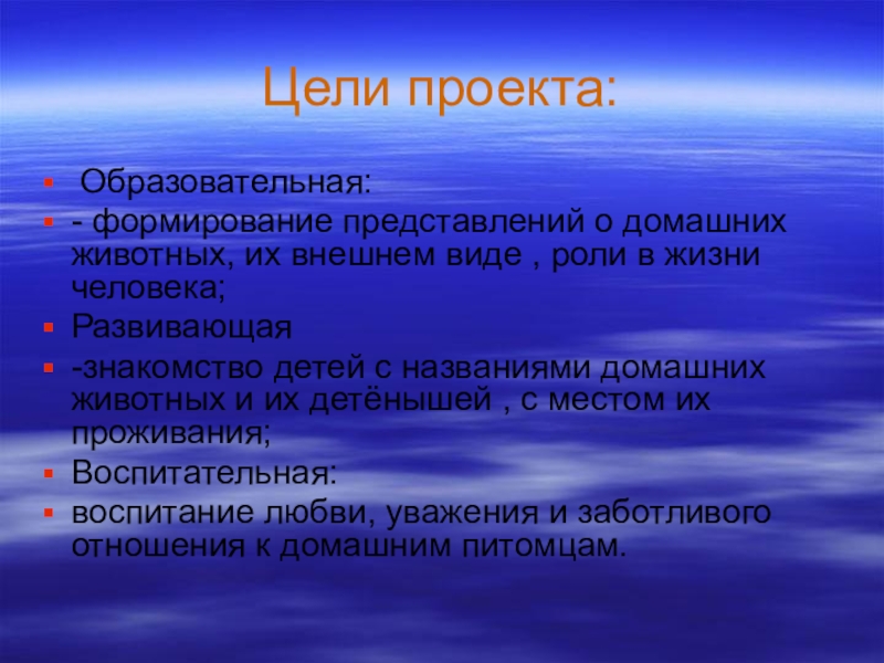 Цели проекта: Образовательная:- формирование представлений о домашних животных, их внешнем виде , роли в жизни человека;Развивающая-знакомство детей