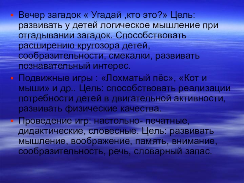 Проведение игр: настольно- печатные, дидактические, словесные. Цель: развивать мышление, воображение, память, внимание, сообразительность, речь, словарный запас.