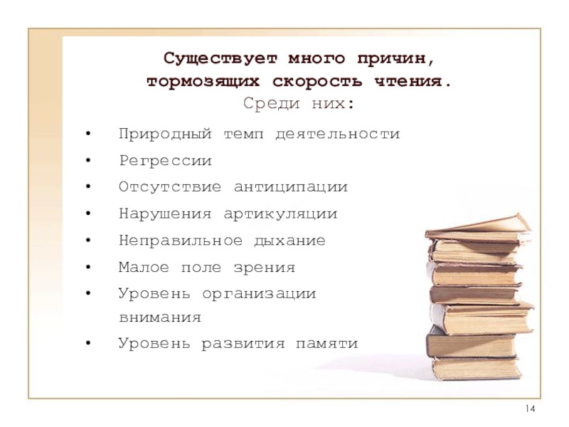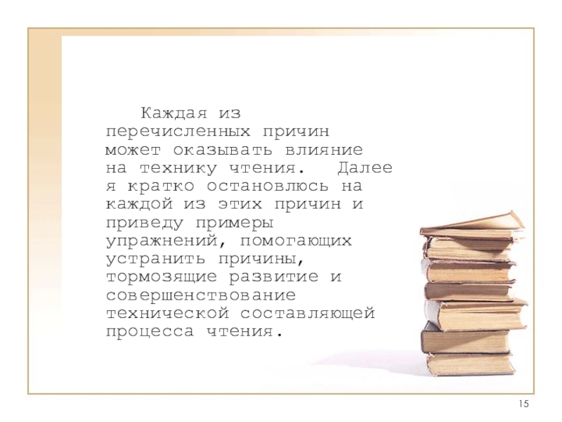 Каждая из перечисленных причин может оказывать влияние на технику чтения. Далее