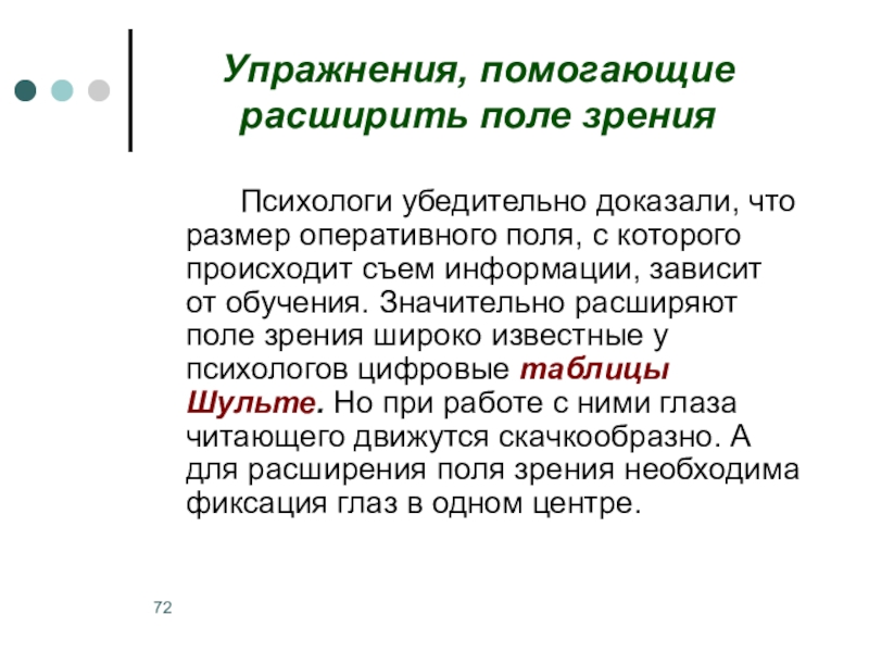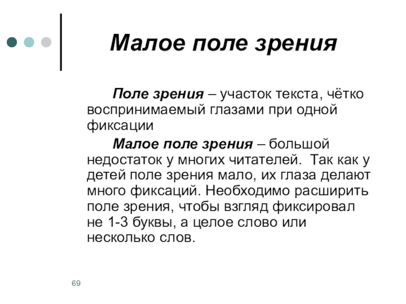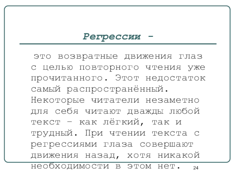 прочитанного. Этот недостаток самый распространённый. Некоторые читатели незаметно для себя читают дважды любой текст – как лёгкий, так и трудный. При чтении текста с регрессиями глаза совершают движения назад, хотя никакой необходимости в этом нет.
