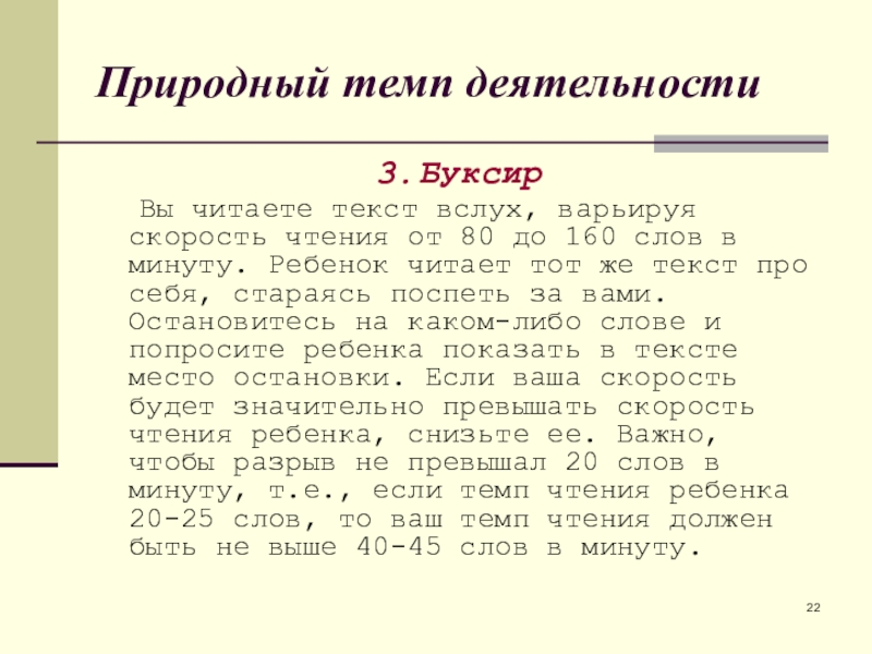 до 160 слов в минуту. Ребенок читает тот же текст про себя, стараясь поспеть за вами. Остановитесь на каком-либо слове и попросите ребенка показать в тексте место остановки. Если ваша скорость будет значительно превышать скорость чтения ребенка, снизьте ее. Важно, чтобы разрыв не превышал 20 слов в минуту, т.е., если темп чтения ребенка 20-25 слов, то ваш темп чтения должен быть не выше 40-45 слов в минуту.