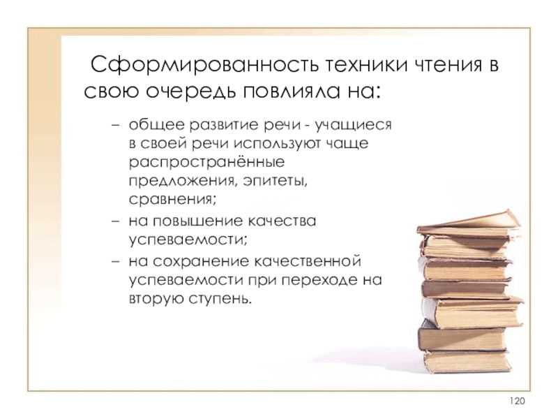 Слайд 120 Сформированность техники чтения в свою очередь повлияла на: