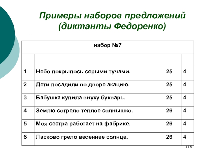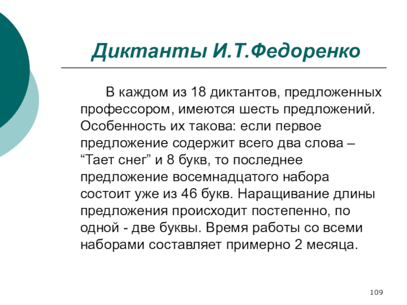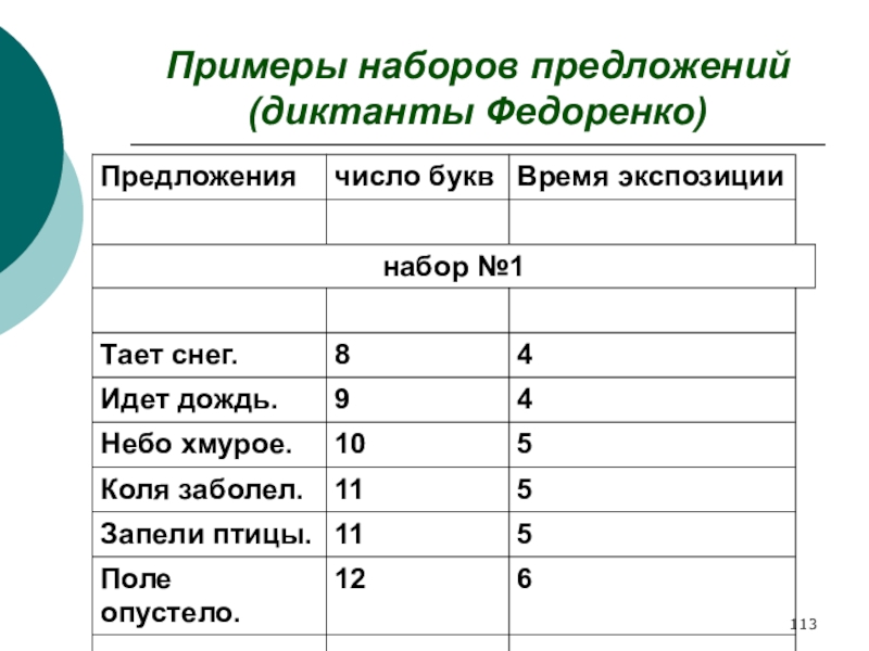 предложений. Особенность их такова: если первое предложение содержит всего два слова – “Тает снег” и 8 букв, то последнее предложение восемнадцатого набора состоит уже из 46 букв. Наращивание длины предложения происходит постепенно, по одной - две буквы. Время работы со всеми наборами составляет примерно 2 месяца.