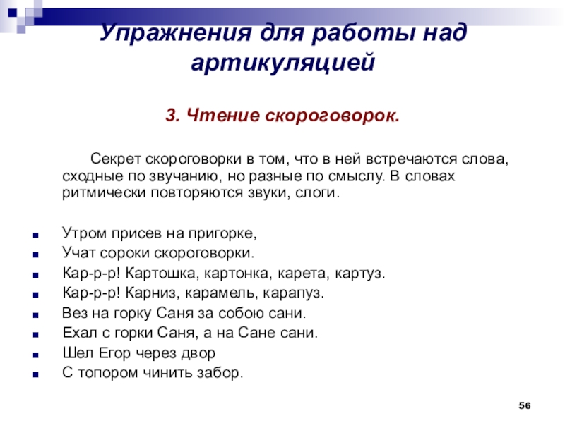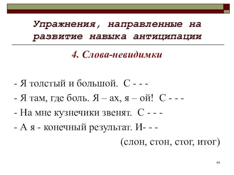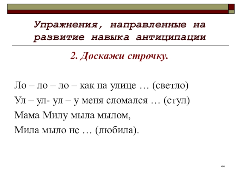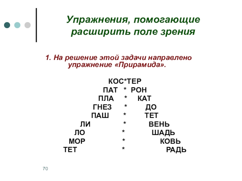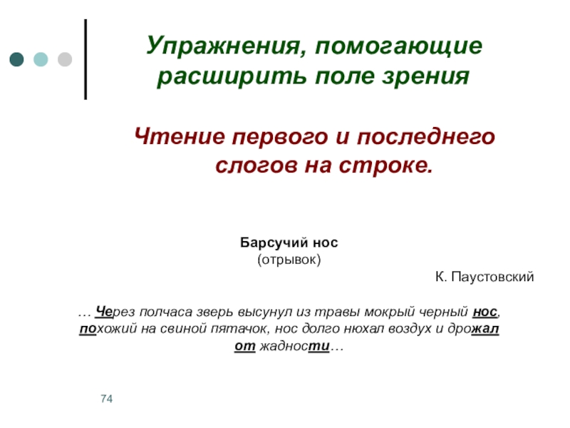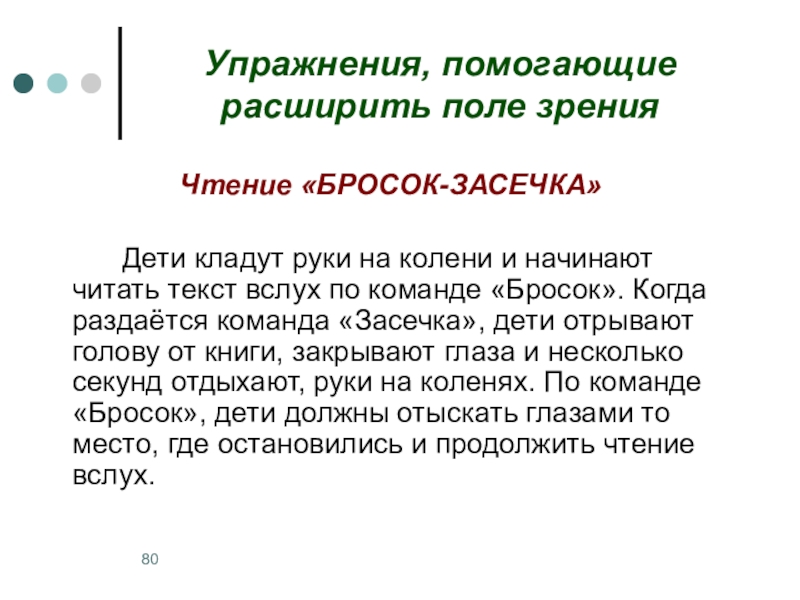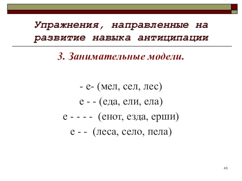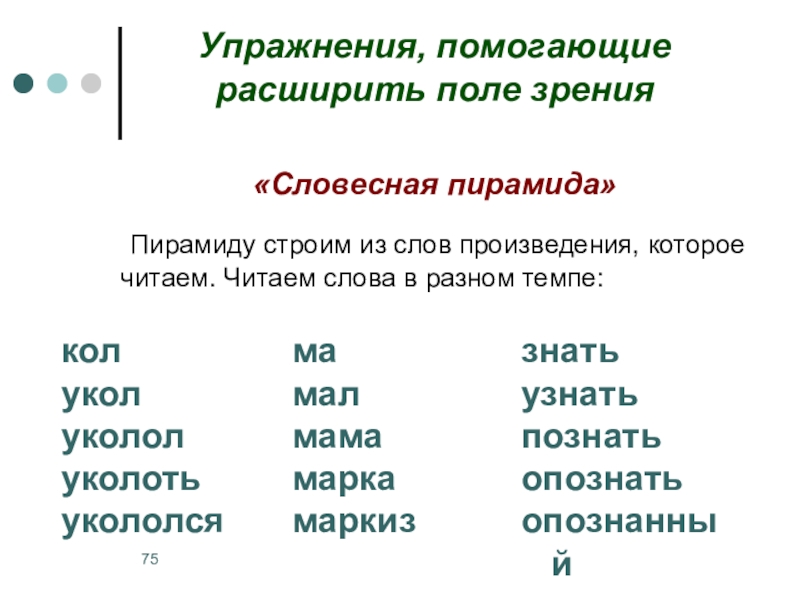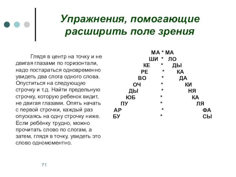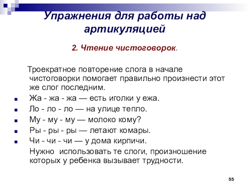 я кратко остановлюсь на каждой из этих причин и приведу примеры упражнений, помогающих устранить причины, тормозящие развитие и совершенствование технической составляющей процесса чтения.