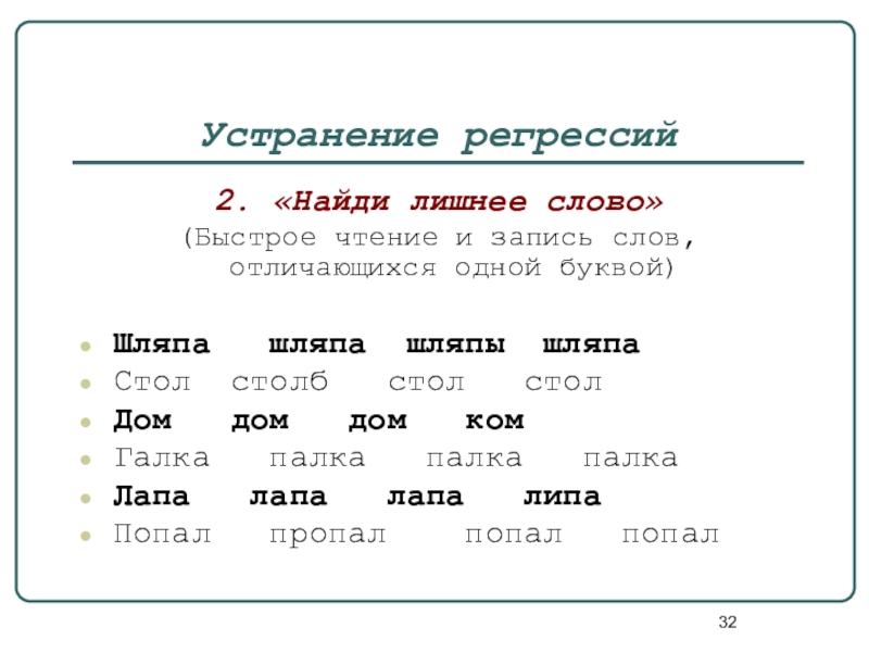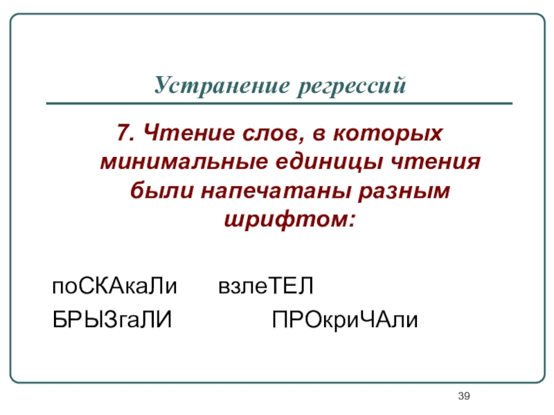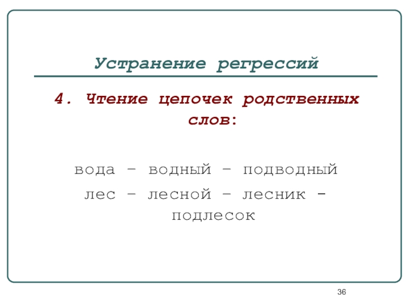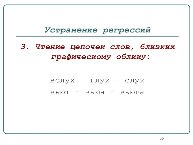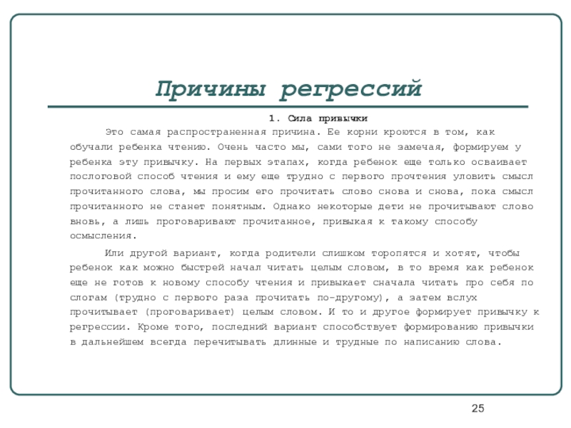 Или другой вариант, когда родители слишком торопятся и хотят, чтобы ребенок как можно быстрей начал читать целым словом, в то время как ребенок еще не готов к новому способу чтения и привыкает сначала читать про себя по слогам (трудно с первого раза прочитать по-другому), а затем вслух прочитывает (проговаривает) целым словом. И то и другое формирует привычку к регрессии. Кроме того, последний вариант способствует формированию привычки в дальнейшем всегда перечитывать длинные и трудные по написанию слова.
