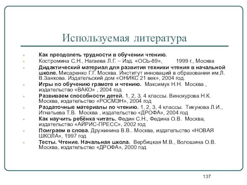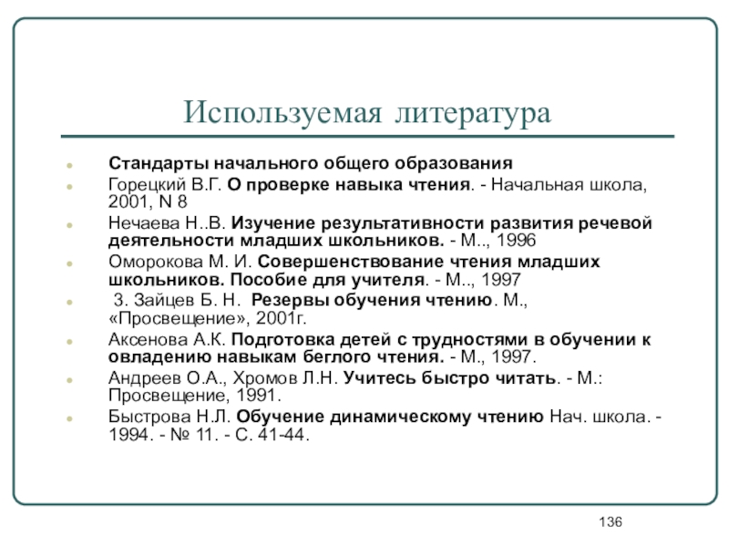 3. Зайцев Б. Н. Резервы обучения чтению. М., «Просвещение», 2001г.