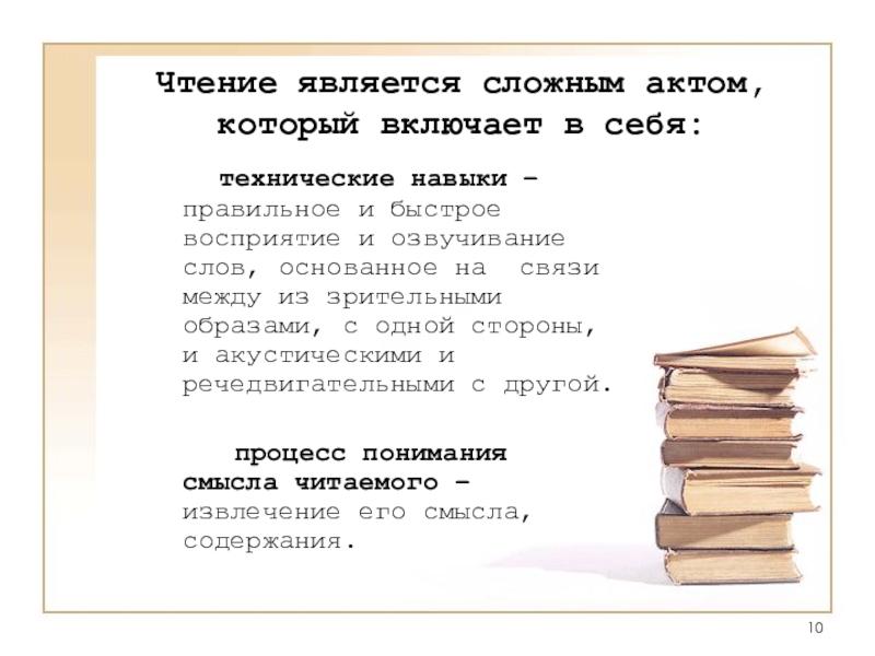 Слайд 10Чтение является сложным актом, который включает в себя: