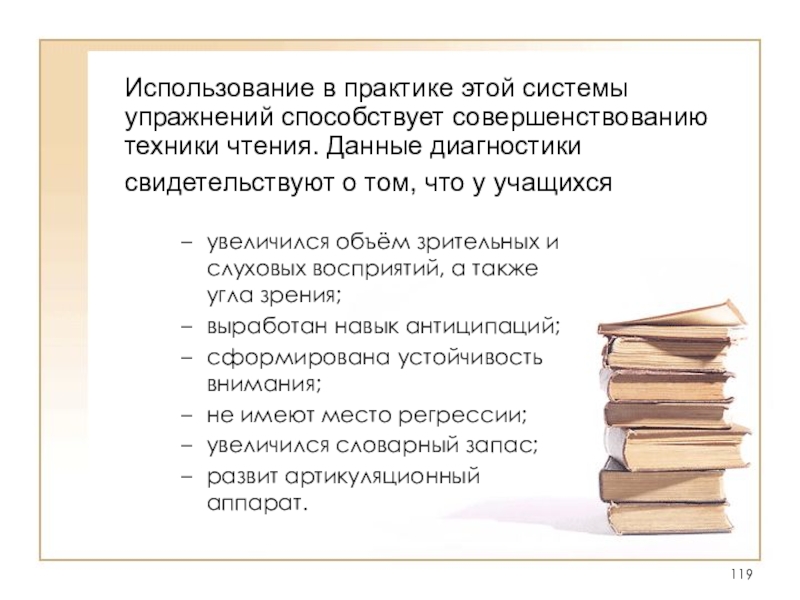 Слайд 119Использование в практике этой системы упражнений способствует совершенствованию техники чтения. Данные