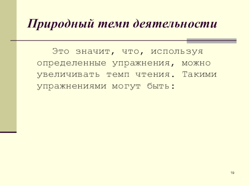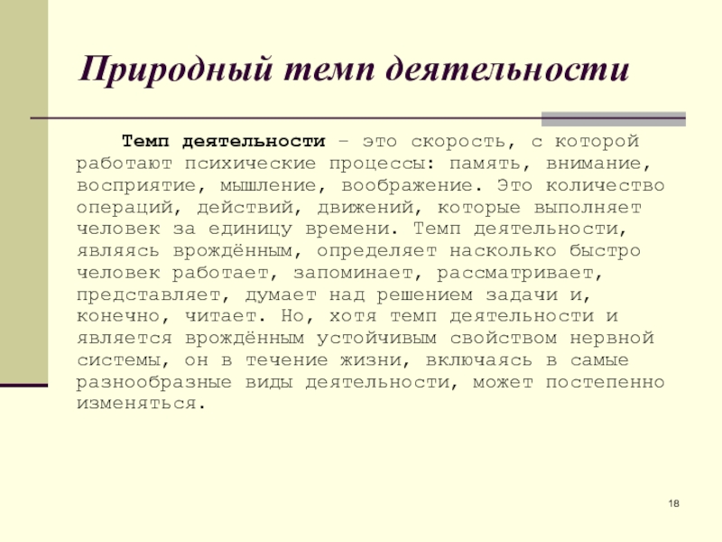 процессы: память, внимание, восприятие, мышление, воображение. Это количество операций, действий, движений, которые выполняет человек за единицу времени. Темп деятельности, являясь врождённым, определяет насколько быстро человек работает, запоминает, рассматривает, представляет, думает над решением задачи и, конечно, читает. Но, хотя темп деятельности и является врождённым устойчивым свойством нервной системы, он в течение жизни, включаясь в самые разнообразные виды деятельности, может постепенно изменяться.