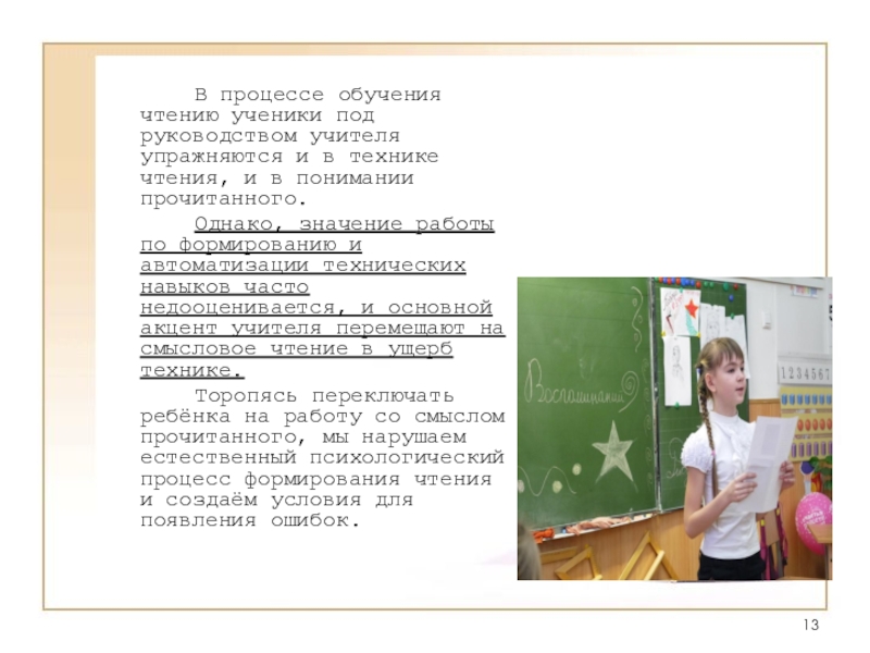 Однако, значение работы по формированию и автоматизации технических навыков часто недооценивается, и основной акцент учителя перемещают на смысловое чтение в ущерб технике.