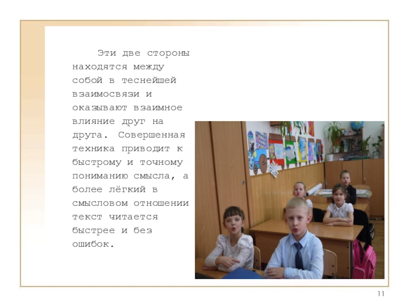взаимное влияние друг на друга. Совершенная техника приводит к быстрому и точному пониманию смысла, а более лёгкий в смысловом отношении текст читается быстрее и без ошибок.