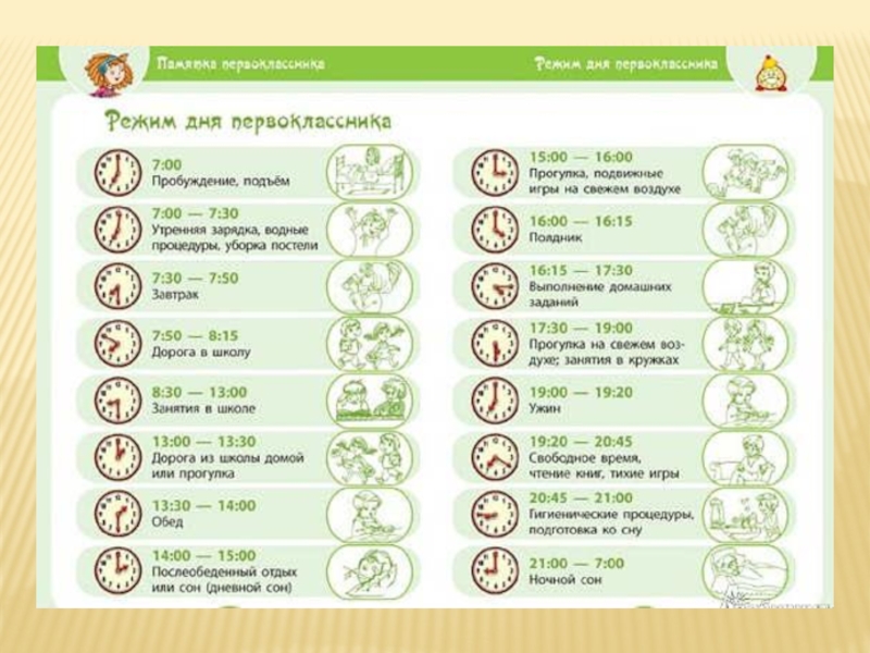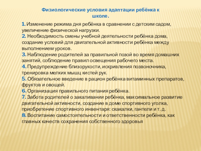 Физиологические условия адаптации ребёнка к школе. 1. Изменение режима дня ребёнка в сравнении с детским садом, увеличение