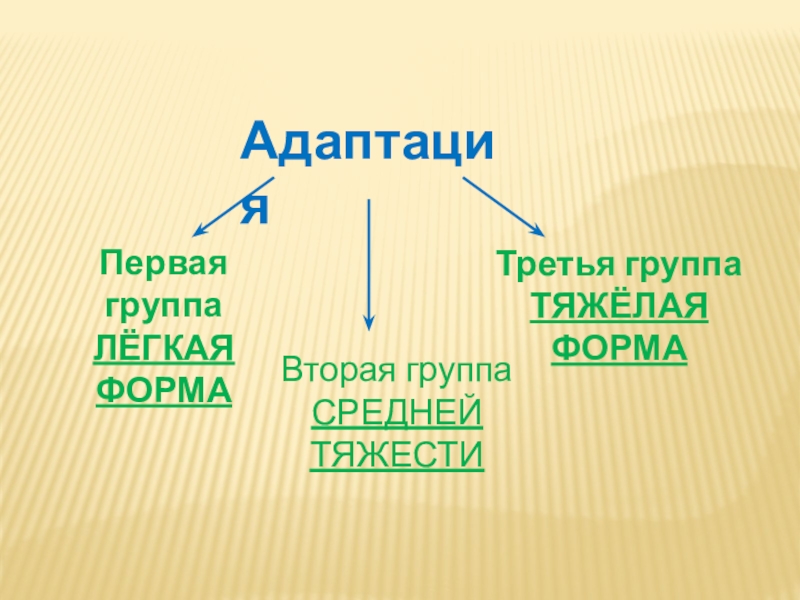 Адаптация Первая группаЛЁГКАЯ ФОРМАВторая группаСРЕДНЕЙ ТЯЖЕСТИТретья группаТЯЖЁЛАЯ ФОРМА