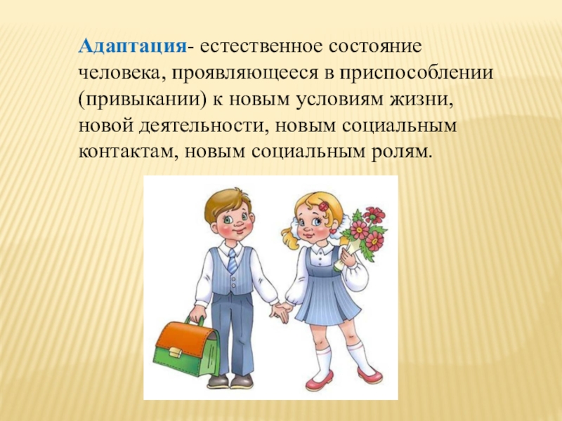 Адаптация- естественное состояние человека, проявляющееся в приспособлении (привыкании) к новым условиям жизни, новой деятельности, новым социальным контактам, новым социальным ролям.