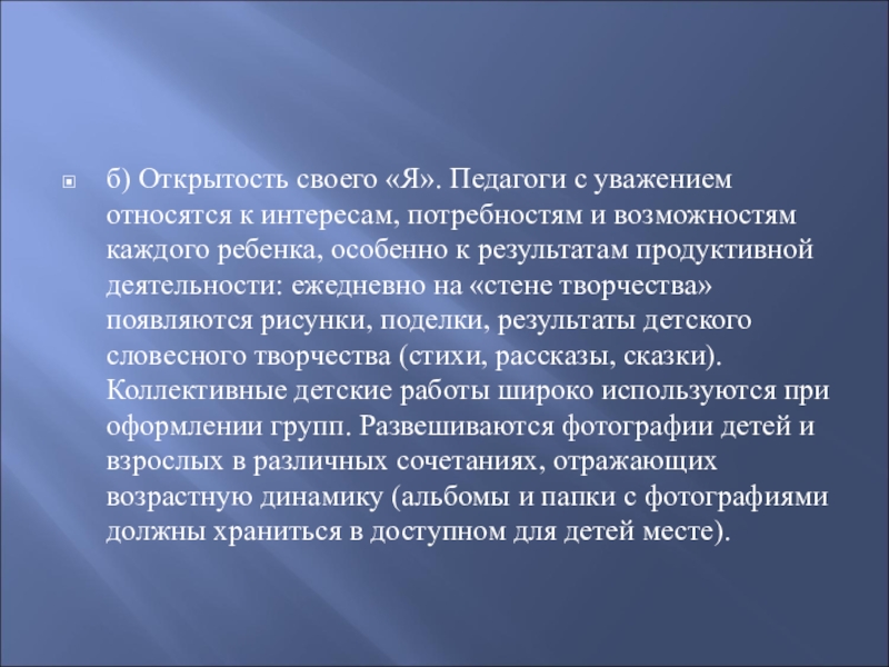 б) Открытость своего «Я». Педагоги с уважением относятся к интересам, потребностям и возможностям каждого ребенка, особенно к результатам продуктивной деятельности: ежедневно на «стене творчества» появляются рисунки, поделки, результаты детского словесного творчества (стихи, рассказы, сказки). Коллективные детские работы широко используются при оформлении групп. Развешиваются фотографии детей и взрослых в различных сочетаниях, отражающих возрастную динамику (альбомы и папки с фотографиями должны храниться в доступном для детей месте).