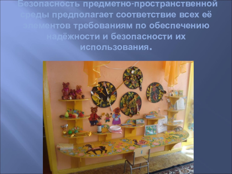 Слайд 10 Безопасность предметно-пространственной среды предполагает соответствие всех её элементов требованиям по