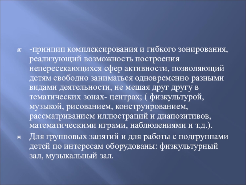 позволяющий детям свободно заниматься одновременно разными видами деятельности, не мешая друг другу в тематических зонах- центрах; ( физкультурой, музыкой, рисованием, конструированием, рассматриванием иллюстраций и диапозитивов, математическими играми, наблюдениями и т.д.).