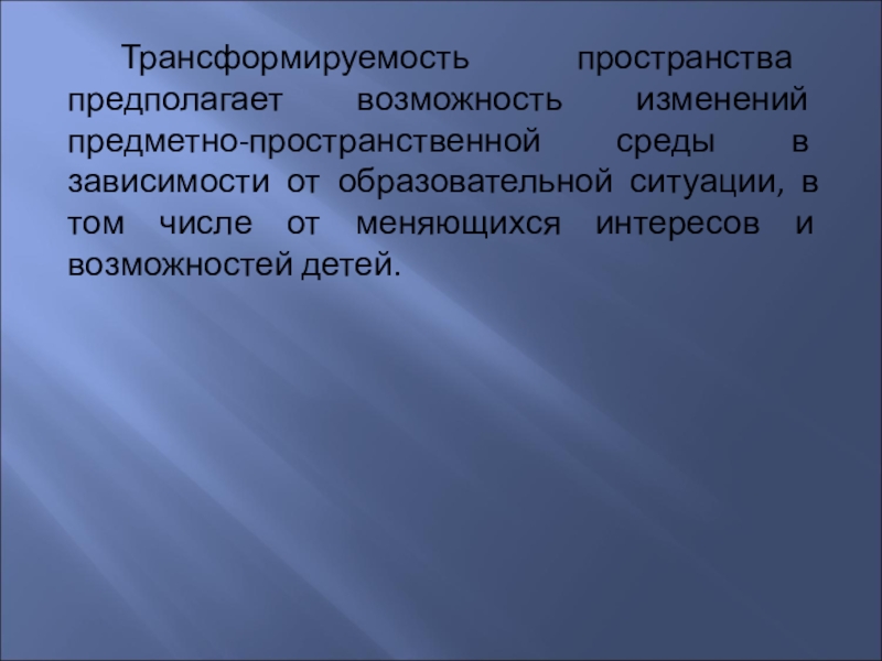 Слайд 16Трансформируемость пространства предполагает возможность изменений предметно-пространственной среды в зависимости от образовательной