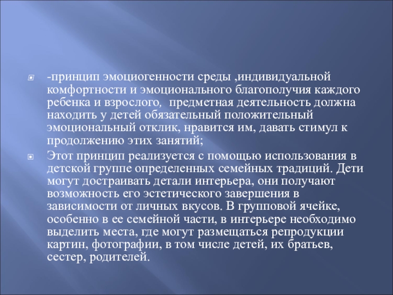 Этот принцип реализуется с помощью использования в детской группе определенных семейных традиций. Дети могут достраивать детали интерьера, они получают возможность его эстетического завершения в зависимости от личных вкусов. В групповой ячейке, особенно в ее семейной части, в интерьере необходимо выделить места, где могут размещаться репродукции картин, фотографии, в том числе детей, их братьев, сестер, родителей.