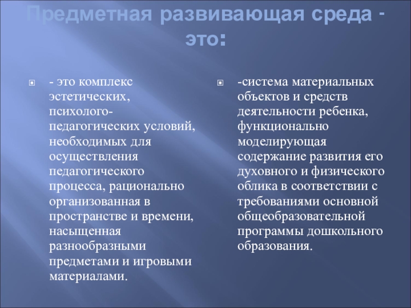 -система материальных объектов и средств деятельности ребенка, функционально моделирующая содержание развития его духовного и физического облика в соответствии с требованиями основной общеобразовательной программы дошкольного образования.