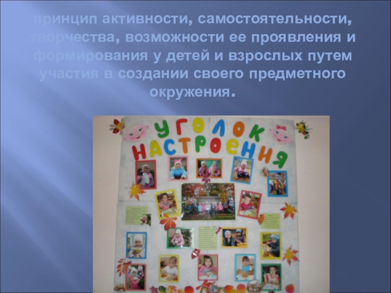 Слайд 20принцип активности, самостоятельности, творчества, возможности ее проявления и формирования у детей и