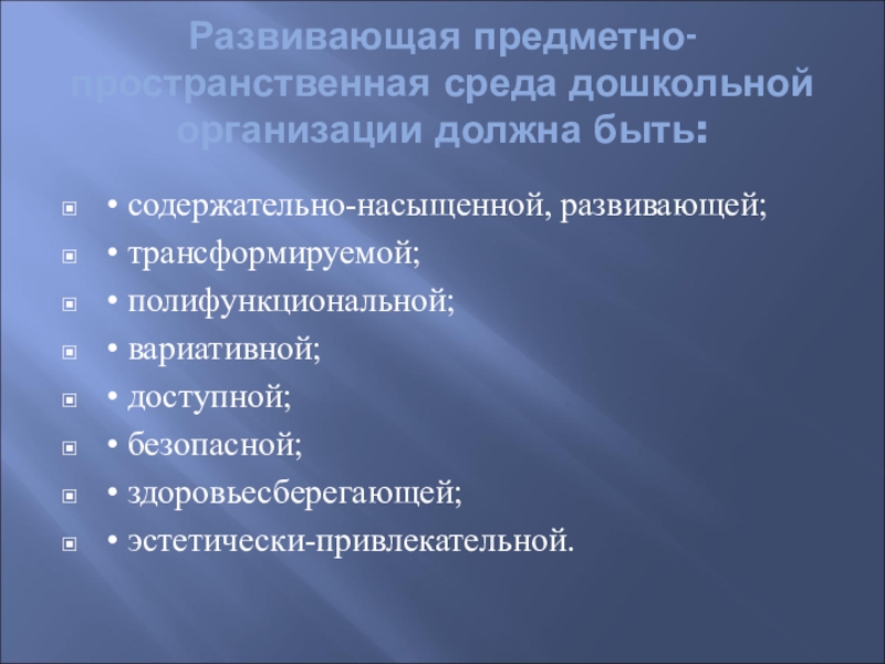 Слайд 3Развивающая предметно-пространственная среда дошкольной организации должна быть: