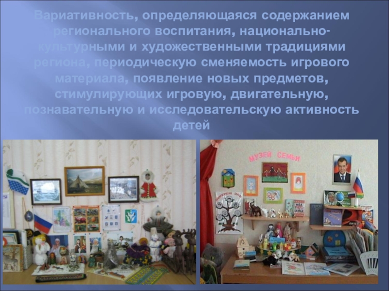 Вариативность, определяющаяся содержанием регионального воспитания, национально-культурными и художественными традициями региона, периодическую сменяемость игрового материала,