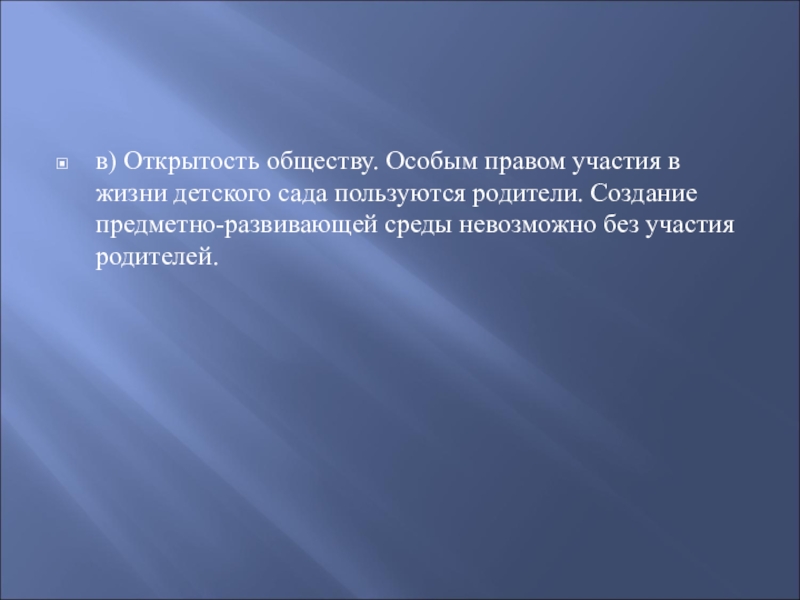 в) Открытость обществу. Особым правом участия в жизни детского сада пользуются родители. Создание предметно-развивающей среды невозможно без участия родителей.