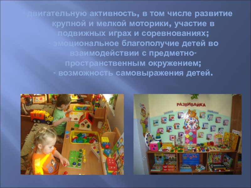 Слайд 6- двигательную активность, в том числе развитие крупной и мелкой моторики,
