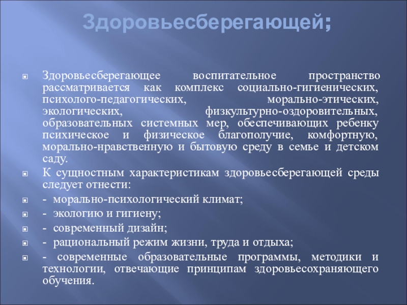К сущностным характеристикам здоровьесберегающей среды следует отнести: