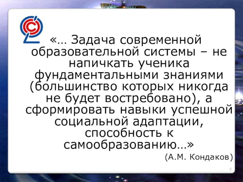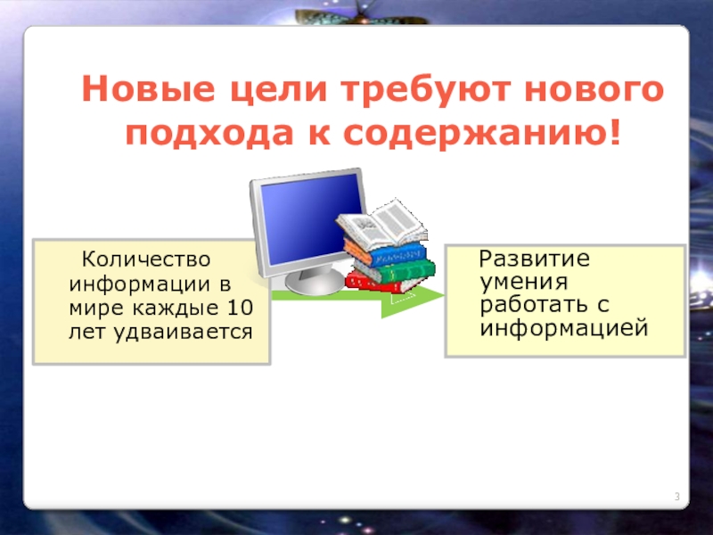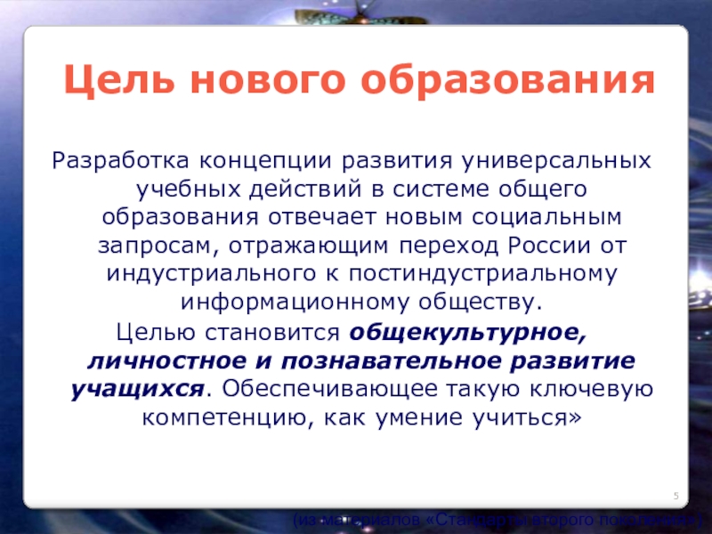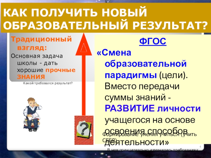 «Смена образовательной парадигмы (цели). Вместо передачи суммы знаний - РАЗВИТИЕ личности учащегося на основе освоения способов деятельности»