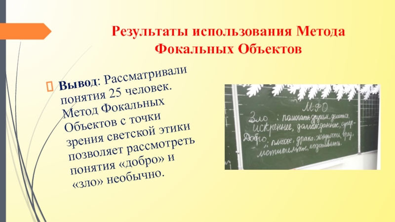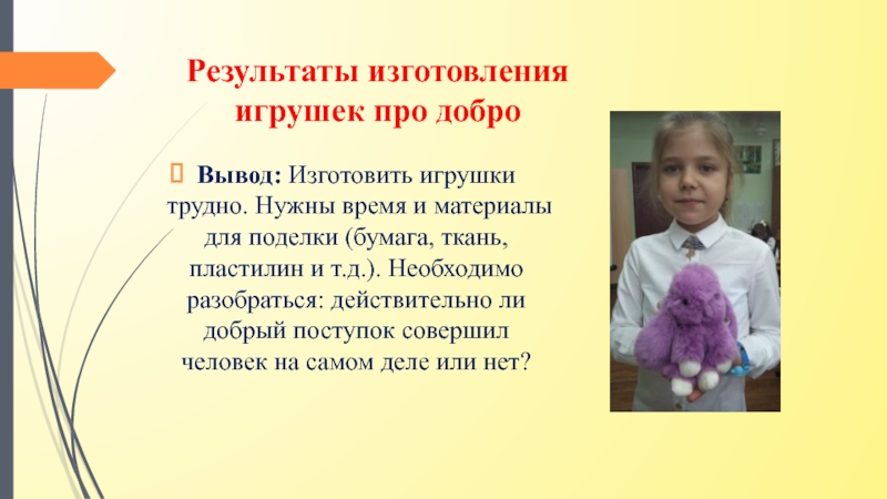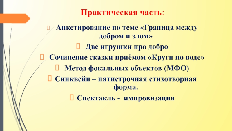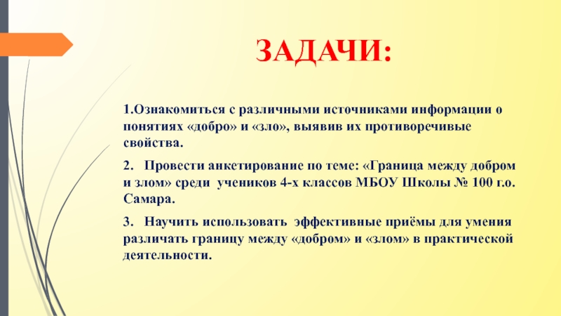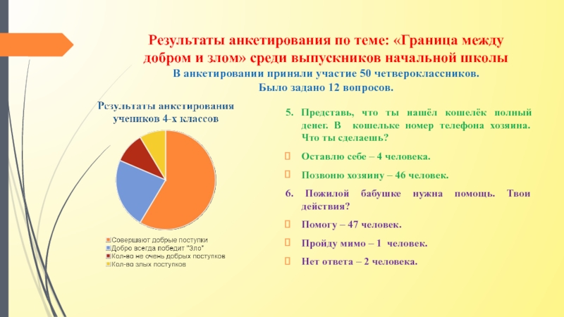 Чтобы проверить утверждение: «Что существуют эффективные способы умения различать границу между понятиями «добро» и «зло», я провела анкетирование среди четвероклассников (10 – 11 лет) МБОУ Школы № 100 г.о. Самара. В анкетировании принимали участие 50 четвероклассников. Было задано 12 вопросов. Свои первые исследования я проводила под руководством учителя.