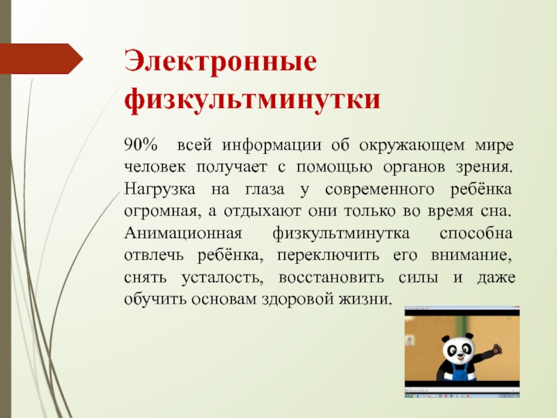 органов зрения. Нагрузка на глаза у современного ребёнка огромная, а отдыхают они только во время сна. Анимационная физкультминутка способна отвлечь ребёнка, переключить его внимание, снять усталость, восстановить силы и даже обучить основам здоровой жизни.