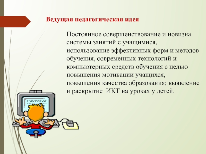 эффективных форм и методов обучения, современных технологий и компьютерных средств обучения с целью повышения мотивации учащихся, повышения качества образования; выявление и раскрытие ИКТ на уроках у детей.