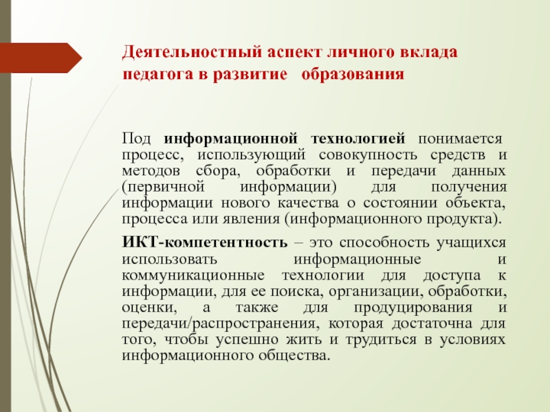 Слайд 10Деятельностный аспект личного вклада педагога в развитие образования