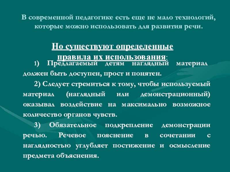 3) Обязательное подкрепление демонстрации речью. Речевое пояснение в сочетании с наглядностью углубляет постижение и осмысление предмета объяснения.
