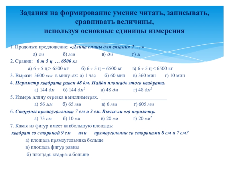 Задания на формирование умение читать, записывать, сравнивать величины,