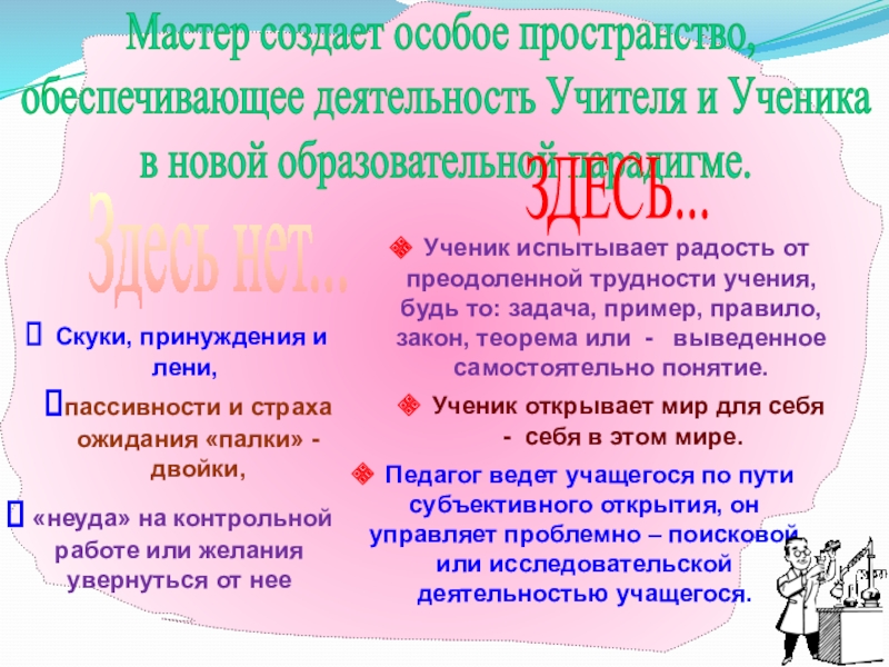 Педагог ведет учащегося по пути субъективного открытия, он управляет проблемно – поисковой или исследовательской деятельностью учащегося.