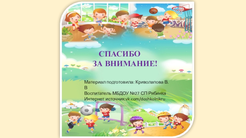 СПАСИБО ЗА ВНИМАНИЕ!Материал подготовила: Криволапова В.ВВоспитатель МБДОУ №27 СП РябинкаИнтернет источник:vk.com/doshkolnikru