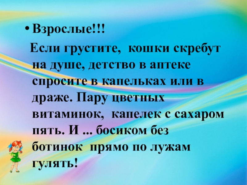 Взрослые!!!  Если грустите,  кошки скребут на душе, детство в аптеке спросите в капельках или в драже.