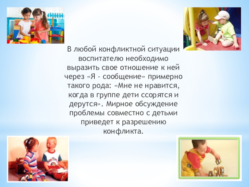 через «Я - сообщение» примерно такого рода: «Мне не нравится, когда в группе дети ссорятся и дерутся». Мирное обсуждение проблемы совместно с детьми приведет к разрешению конфликта.