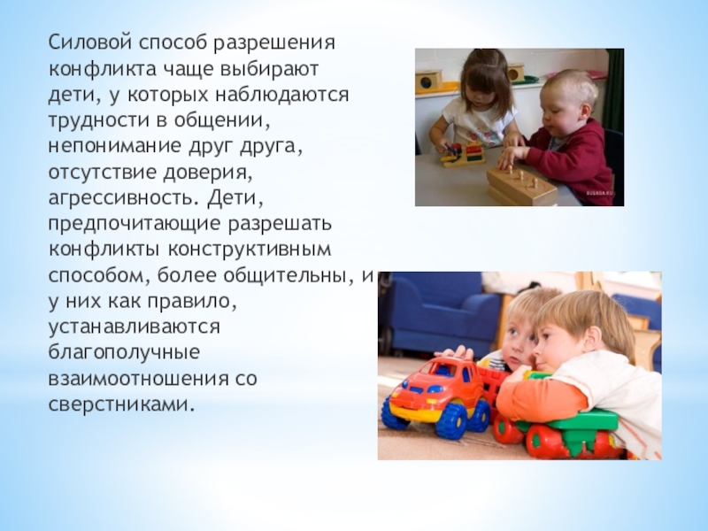 Слайд 7Силовой способ разрешения конфликта чаще выбирают дети, у которых наблюдаются трудности